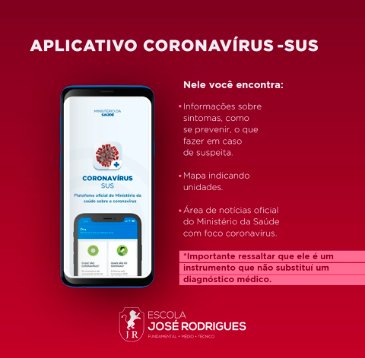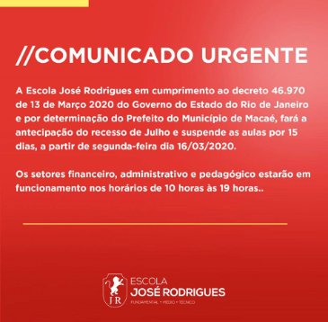 Diante do estado de pandemia por conta do Corona vírus e seguindo as orientações para que todos, na medida do possível, fiquem em casa, medidas estratégicas administrativas, pedagógicas e financeiras foram tomadas pela Escola José Rodrigues para garantir a saúde e segurança de todos. Dessa forma, todos os funcionários estão trabalhando em sistema home office. O setor pedagógico está criando salas virtuais do Google para serem utilizadas pelos alunos e seus instrutores (com conteúdos e atividades) objetivando minimizar o impacto na vida acadêmica de nossos alunos. Todas as orientações detalhadas sobre as salas virtuais serão encaminhadas em breve para os alunos. Desde já agradecemos a compreensão de todos neste momento de incertezas, porém temos a convicção que estamos tomando todas as medidas cabíveis para superarmos juntos essa pandemia. .